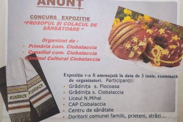 Concurs Expozitie „Prosopul și colacul de sarbatoare”. Expoziția v-a fi amenajată în data de 03.06.2022 , examinată de organizatori. Participanții: Grădinița s.Flocoasa Grădinița s. Ciobalaccia Liceul N.Mihai CAP Ciobalaccia Centru de sănătate Doritorii comunei, familii, prieteni, străzi. Organizat de:      Primăria com. Ciobalaccia Consiliul […]