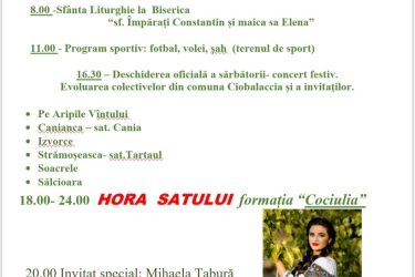Stimați consăteni, vă invităm la sarbatoarea dedicată Hramului localității comunei Ciobalaccia în data de 03.06.2022, cu următorul program festiv: 8.00 -Sfânta Liturghie la Biserica “Sf. Împărați Constantin și maica sa Elena” 11.00 – Program sportiv: fotbal, volei, şah (terenul de sport) 16.30 – Deschiderea oficială […]