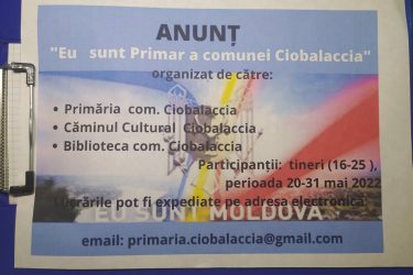 Primăria com. Ciobalaccia împreuna cu Căminul Cultural Ciobalaccia, Biblioteca com. Ciobalaccia anunță concurs de eseuri ” Eu sunt Primar al comunei Ciobalaccia”. Participanții: tineri 16-25 ani, perioada 20-31 mai 2022. Lucrările pot fi expediate la adresa electronica: primaria.ciobalaccia@gmail.com